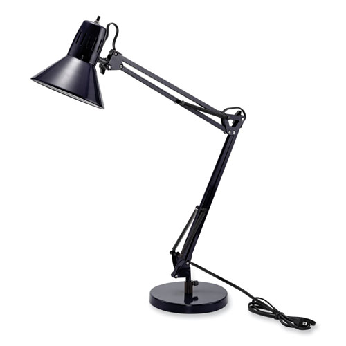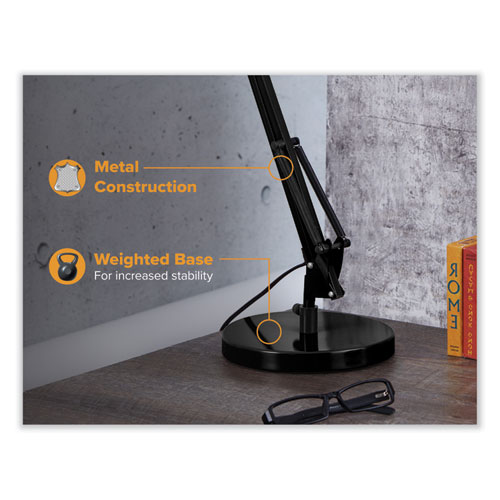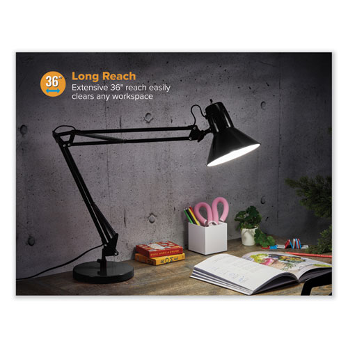 This Bostitch metal desk lamp brings a vintage twist to your normal office décor. Featuring an all-metal, durable construction, this black lamp with flat base will gracefully sit on any desk or table in your home, office and even home office. Perfect for architects, crafters and those looking to read a good book, this lamp boasts a multi-joint, adjustable arm that will shine bright lighting on any surface. Easily plug this electric lamp in to any accessible outlet and let the bright LED light shine a flicker-free light zone that is clear of shadows, halos and troublesome glares. The unique, extensive 36″ reach easily clears monitors and other objects so nothing will get in your way or your light’s way when completing a task.