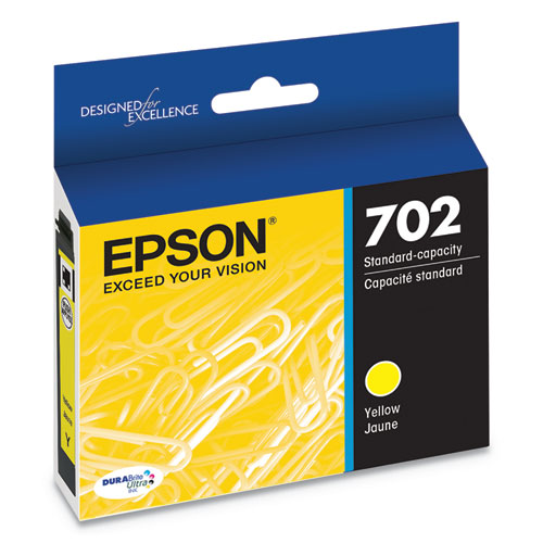 Product Details** Global Product Type Ink/Ink Cartridges OEM/Compatible OEM Supply Type Ink Ink Base Pigment-Based Device Types Inkjet Printer Color(s) Yellow Page-Yield 300 Market Indicator (Cartridge Number) 702 Print Supply Technology DURABrite Ultra™ Remanufactured No For Use With Epson® WorkForce® Pro WF-3720 Product Biodegradability Indicator N Product Biodegradability in Days 0 Product Compostability Indicator N Pre-Consumer Recycled Content Percent 0% Post-Consumer Recycled Content Percent 0% Total Recycled Content Percent 0% Country Of Origin ID Carton Weight 3 lbs. Carton Pack Quantity 32 EA Pack Quantity 0 UPC 010343931947 UNSPSC 44103105 Shipping Weight & Item Dimensions Weight 0.1 lbs. Length 4.4 in Height 0.9 in Width 4.2 in