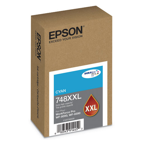 Product Details** Global Product Type Ink/Ink Cartridges OEM/Compatible OEM Supply Type Ink Yield Type Extra High-Yield Device Types Inkjet Printer Color(s) Cyan Page-Yield 7,000 Market Indicator (Cartridge Number) 748XXL Print Supply Technology DURABrite Pro™ Remanufactured No For Use With Epson® WorkForce® Pro WF-6090, 6590, 8090, 8590 Product Biodegradability Indicator N Product Biodegradability in Days 0 Product Compostability Indicator N Pre-Consumer Recycled Content Percent 0% Post-Consumer Recycled Content Percent 0% Total Recycled Content Percent 0% Country Of Origin ID Carton Weight 9 lbs. Carton Pack Quantity 16 EA Pack Quantity 0 UPC 010343914452 UNSPSC 44103105 Shipping Weight & Item Dimensions Weight 0.55 lbs. Length 7.4 in Height 1.3 in Width 4.6 in