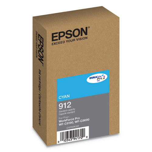 Product Details** Global Product Type Ink/Ink Cartridges OEM/Compatible OEM Supply Type Ink Ink Base Pigment-Based Device Types Inkjet Printer Color(s) Cyan Page-Yield 1,700 Market Indicator (Cartridge Number) 912 Print Supply Technology DURABrite Pro™ Remanufactured No For Use With Epson® WorkForce® Pro WF-C8690 Product Biodegradability Indicator N Product Biodegradability in Days 0 Product Compostability Indicator N Pre-Consumer Recycled Content Percent 0% Post-Consumer Recycled Content Percent 0% Total Recycled Content Percent 0% Country Of Origin CN Carton Weight 8 lbs. Carton Pack Quantity 16 EA Pack Quantity 0 UPC 010343941700 UNSPSC 44103105 Shipping Weight & Item Dimensions Weight 0.4 lbs. Length 7.4 in Height 1.3 in Width 4.6 in