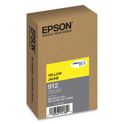 Product Details** Global Product Type Ink/Ink Cartridges OEM/Compatible OEM Supply Type Ink Ink Base Pigment-Based Device Types Inkjet Printer Color(s) Yellow Page-Yield 1,700 Market Indicator (Cartridge Number) 912 Print Supply Technology DURABrite Pro™ Remanufactured No For Use With Epson® WorkForce® Pro WF-C8190, C8690 Product Biodegradability Indicator N Product Biodegradability in Days 0 Product Compostability Indicator N Pre-Consumer Recycled Content Percent 0% Post-Consumer Recycled Content Percent 0% Total Recycled Content Percent 0% Country Of Origin CN Carton Weight 8 lbs. Carton Pack Quantity 16 EA Pack Quantity 0 UPC 010343941809 UNSPSC 44103105 Shipping Weight & Item Dimensions Weight 0.4 lbs. Length 7.4 in Height 1.3 in Width 4.6 in