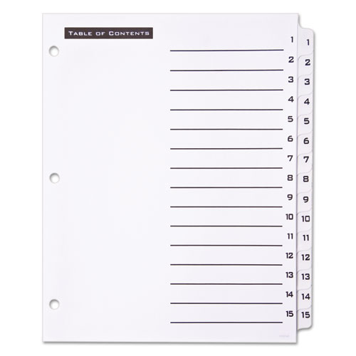 Product Details** Global Product Type Printed Numeric Index Dividers Index Divider Style Arabic Numeric Tab Orientation Side Tab Tab Style 15-Tab Color Family White Punched/Unpunched 3-Hole Punched Index Divider Size 11 x 8.5 For Use With Ring Binders Index Divider Material(s) Paper Index Divider Color(s) White Tab Material(s) Plastic Tab Color(s) White Tab Title(s) 1 to 15 Tab Title Color(s) Black Binding Edge Feature(s) Single-Sided Gold Plastic Edge Reinforcing Machine Compatibility Inkjet Printers,Laser Printers Index Divider Form Quantity 1 Set Product Biodegradability Indicator N Product Biodegradability in Days 0 Product Compostability Indicator N Pre-Consumer Recycled Content Percent 0% Post-Consumer Recycled Content Percent 0% Total Recycled Content Percent 0% Country Of Origin MX Carton Weight 11 lbs. Carton Pack Quantity 24 ST Pack Quantity 15 EA UPC 072782116743 UNSPSC 44122008 Shipping Weight & Item Dimensions Weight 0.275 lbs. Length 10.9 in Height 0.1 in Width 8.9 in