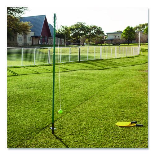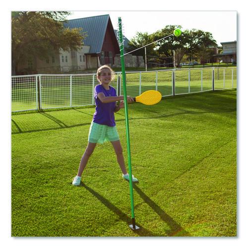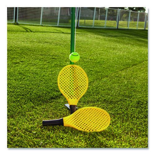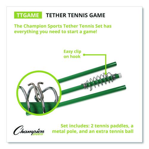 Similar to tetherball, tether tennis uses two tennis paddles to wrap a ball around a pole. The Champion Sports Tether Tennis Set has everything you need to start a game! Featuring a metal pole with swivel arm and spiral coil, the easy clip-on hook attaches the tennis ball to the pole with a 64” rope. The set includes two tennis paddles and one extra tennis ball.