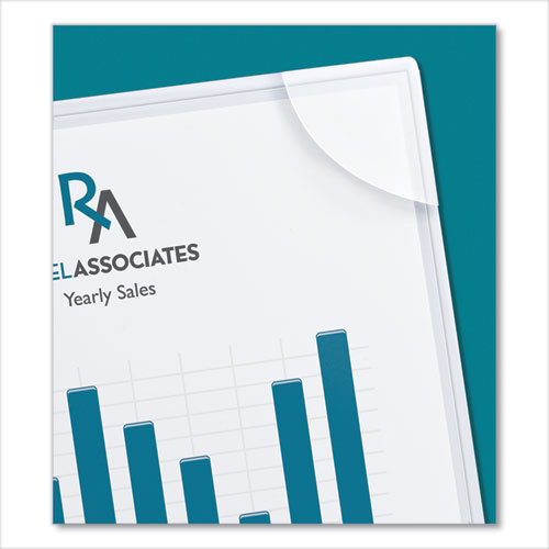 Special Corner Lock® feature fits snugly over the clear front cover to ensure documents don’t fall out. Reusable lightweight sleeves are perfect for active projects and organizing office space. Transparent folder allows you to view contents easily. Non-stick polypropylene won’t lift print. Sleeves hold up to 20 sheets of 8 1/2 x 11 paper.