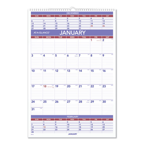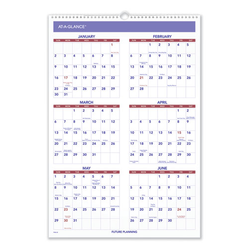 Three-month view with plenty of space for planning in the current month. Three months per page: large current month with ruled blocks, condensed past and future months. Federal holidays highlighted. Bonus page: six future months. Chipboard backing; white wirebound with hanging loop. Contemporary design with plenty of writing space. Printed on high-quality paper with superior ink bleed resistance.