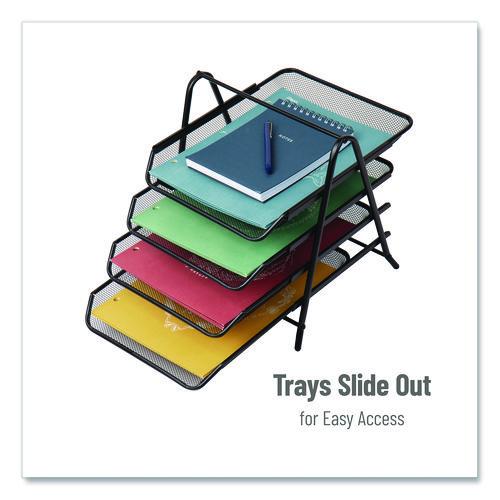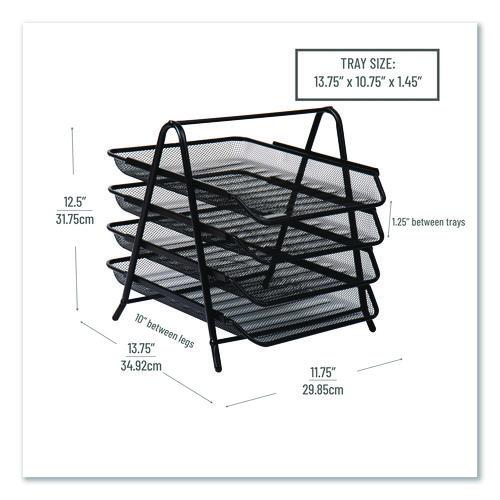 Product Details** Global Product Type Horizontal & Stacking Desktop Document Racks & Sorters Number of Compartments 4 For File Size Standard Load Orientation Front Color Family Black Color(s) Black Material(s) Wire Mesh Width 13.75″ Depth 12″ Height 12.5″ Product Biodegradability Indicator N Product Biodegradability in Days 0 Product Compostability Indicator N Pre-Consumer Recycled Content Percent 0% Post-Consumer Recycled Content Percent 0% Total Recycled Content Percent 0% Special Features 4-Tier Country Of Origin CN Carton Weight 32 lbs. Carton Pack Quantity 10 EA Pack Quantity 0 UPC 887530009150 UNSPSC 44111503 Shipping Weight & Item Dimensions Weight 3 lbs. Length 14.5 in Height 2.7 in Width 11.3 in