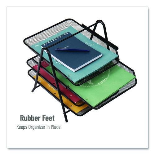 Multi-tiered design provides ample storage capacity for storing and organizing a variety of items such as files, mail, documents, folders, bills and letters. Declutter your desk or counter and keep everything within easy reach. The attached rubber feet ensure that the organizer stays in place. Access your items with confidence, knowing that the organizer won’t slip or move around on your desk. The rubber feet also help protect your desk surface from scratches. With a convenient carrying handle, this tray organizer is easily portable. You can take it with you wherever you work, whether it’s in a college dorm, office, home, school, conference room, business, hotel or any other setting. This versatile organizer streamlines your space and keeps papers in place, making it an ideal solution for improving organization and efficiency. Accommodates standard-sized documents and provides ample storage space while remaining compact.