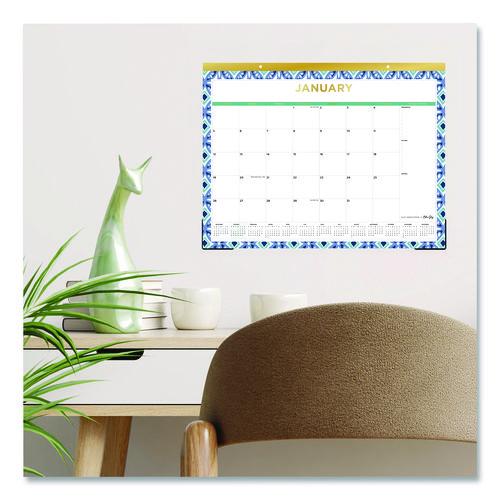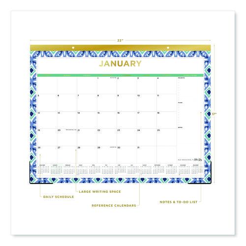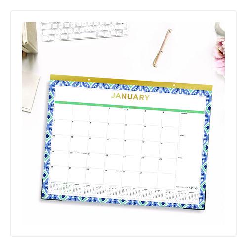 Plan for success and check off your accomplishments as you go. The Blue Sky® Tile Desk Pad Calendar features generously sized daily blocks with all major holidays listed, a Notes & To-Do checklist on the right and a row of 13 reference calendar blocks below. Each month is listed in gold-tone foil, and each page is framed in a lovely Tile geometric design. Sturdy backboard provides a cushioned writing surface, and clear corners keep each page flat. Thick, premium quality paper minimizes the potential for ink bleed through.