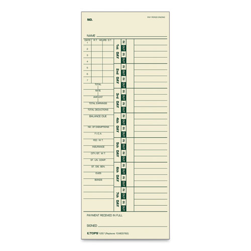 Product Details** Global Product Type Compatible Time Clock Cards Size 3.5 x 9 Time Period Weekly Printing Sides Two Sides Card Quantity 500 OEM Card Number 10-800762 Clock/Recorder Compatibility Acroprint® 150R, 175, 180, ESP125R,Simplex 10-800762, 1950-9308 Product Biodegradability in Days 0 Pre-Consumer Recycled Content Percent 0% Post-Consumer Recycled Content Percent 0% Total Recycled Content Percent 0% Special Features Manila Stock Printed Green on Front—With area to calculate regular hours, extra hours, deductions, gross and net pay per week. Prints red on back. Country Of Origin MX Carton Weight 37 lbs. Carton Pack Quantity 3000 EA Pack Quantity 0 UPC 025932125713 UNSPSC 44103205 Shipping Weight & Item Dimensions Weight 5.462 lbs. Length 6.3 in Height 3.9 in Width 9.6 in
