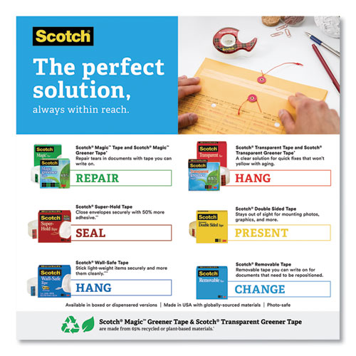 When you have a million and one things to do, there’s one tape to get-Scotch® Transparent Tape. It’s clearly strong-holds things together in an instant; keeps things together for a long time. Clearly multi-purpose-ideal for all the jobs you need to get done. And clearly…clear-using 3M adhesive technology, it goes on transparently and won’t yellow with age. Scotch® Transparent Tape Refills fit into all standard dispensers, glide off the roll smoothly, and cut easily-without wasted tape. Whatever you need to get done, wherever you are-home, work or school-Scotch® Transparent Tape Refill Rolls are clearly ready to go to work.