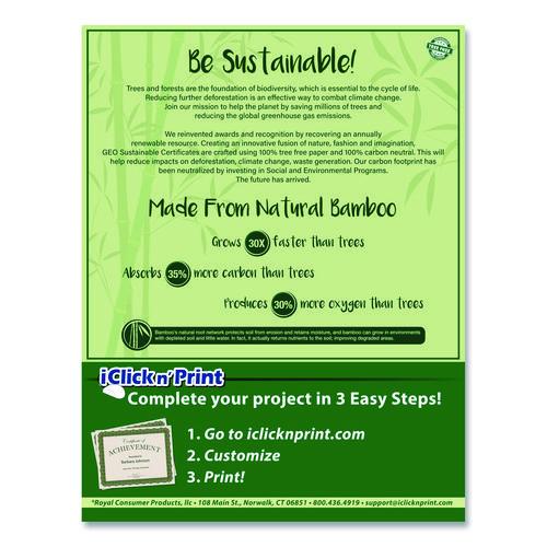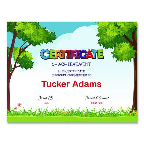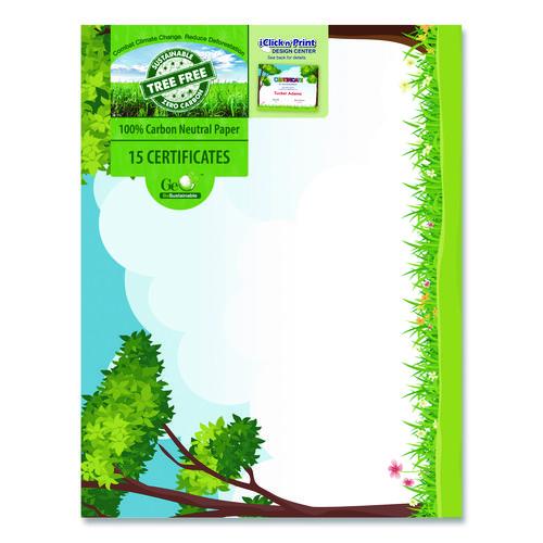 Product Details** Global Product Type Printable Certificates Shape Rectangular Color Family Multicolor Paper Basis Weight (lb) 65 lb Bond Theme Outside Scene Color(s) Green/Brown/Blue Border Color(s) Blue/Green Width 8.5″ Height 11″ For Use With Geographics® Certificate/Document Cover: Black, Black Tree Free, Metallic Blue, Navy Blue, Navy Blue Tree Free Product Biodegradability Indicator N Product Biodegradability in Days 0 Product Compostability Indicator N Pre-Consumer Recycled Content Percent 100% Post-Consumer Recycled Content Percent 0% Total Recycled Content Percent 100% Country Of Origin CN Carton Weight 2 lbs. Carton Pack Quantity 10 PK Pack Quantity 15 EA UPC 071064499505 UNSPSC 49101705 Shipping Weight & Item Dimensions Weight 1 lbs. Length 0.4 in Height 11.25 in Width 8.75 in
