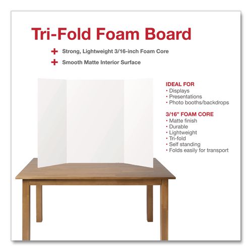 Product Details** Global Product Type Tri-Fold Presentation & Project Boards Material(s) EVA Foam Color(s) White Art Board Type Tri-Fold Display & Presentation Board Color Assortment White Folded Board Size (W x H) 18″ x 48″ Board Size Open (W x H) 36″ x 48″ Art Board Thickness 0.2″ Product Biodegradability Indicator N Product Biodegradability in Days 0 Product Compostability Indicator N Pre-Consumer Recycled Content Percent 0% Post-Consumer Recycled Content Percent 0% Total Recycled Content Percent 0% Country Of Origin CN Carton Weight 10 lbs. Carton Pack Quantity 6 EA Pack Quantity 0 UPC 810123682089 UNSPSC 60121139 Shipping Weight & Item Dimensions Weight 1.64 lbs. Length 0.2 in Height 48 in Width 36 in