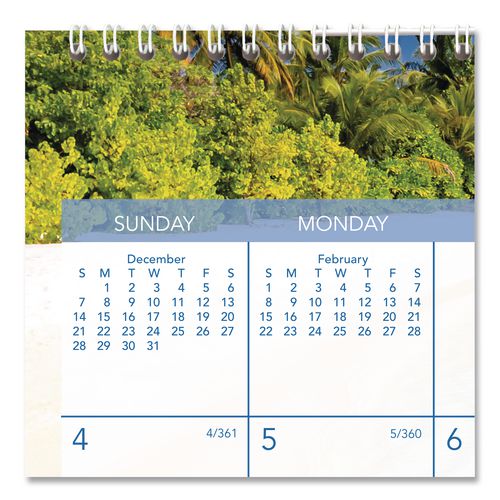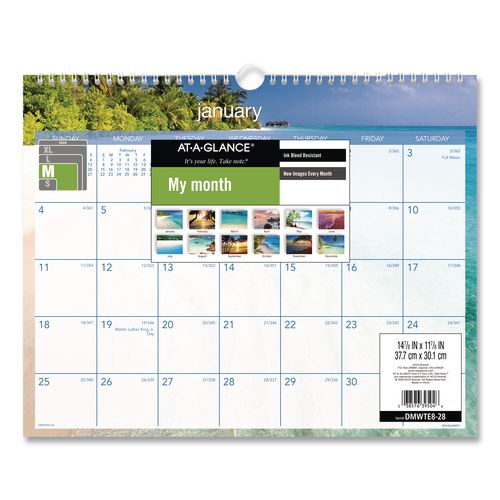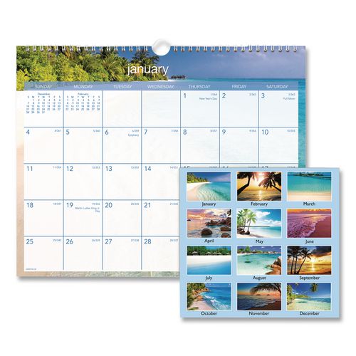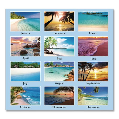 Travel to a different tropical locale every month — this calendar is sure to brighten your spirits with its full-color images. One month per page with unruled blocks; past and future months reference. Chipboard backing; wirebound with hanging loop. Printed on high-quality, recycled paper containing post-consumer recycled material.