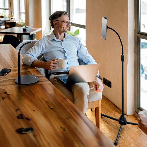 Get the best of both worlds with the Durable® TWIST COMBI Table and Floor Stand with 360° rotation for Tablets, iPads, iPhones and Androids. Featuring a convenient desk stand and a telescopic tripod, users can choose between a table or floor angle depending on their needs. Compatible with all tablets, iPads and iPhones ranging from 4.7″ to 13″ and weighing up to 1.8 lbs. The tripod can extend up to 5 ft 5″ tall and is 27″ when folded, conveniently fitting in the included storage bag for lightweight transporting. Perfect for recording your own content, Get Ready with Me, live broadcasting, watching videos, following instructions when cooking and so much more. Includes cable management slots on both the table and floor stand so you can charge your devices for total flexibility. The non-slip pads on both stands also keep your device protected and stable while in use.