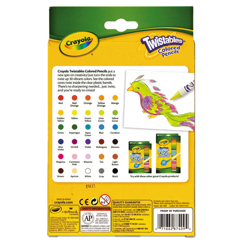 Product Details** Global Product Type Art Pencils Retractable Yes Eraser (Yes/No) No Color Family Multicolor HB Graphite Scale 2B Refillable No Graphite Color(s) Assorted Graphite Color Assortment 30 Assorted Colors Pencil Barrel Color(s) Assorted Pencil Barrel Color Assortment 30 Assorted Colors Pencil Barrel Material Wood Pencil Grip Type Smooth Round Graphite Diameter 2 mm Pocket Clip Indicator No Art/Drafting Pencil Grade All-Purpose/Scholastic Mechanical Pencil Advance Type Twist-Advance Mechanical Pencil Sleeve Type Fixed Sleeve Pre-Sharpened Woodcase (Yes/No) No Age Recommendation Ages 6 and Up Product Biodegradability Indicator N Product Biodegradability in Days 0 Product Compostability Indicator N Green Information Contains 100% reforested wood. Compliance Standards ACMI AP Non-Toxic Certified,Conforms to ASTM D 4236 Pre-Consumer Recycled Content Percent 0% Post-Consumer Recycled Content Percent 0% Total Recycled Content Percent 0% Country Of Origin VN Carton Weight 16 lbs. Carton Pack Quantity 24 PK Pack Quantity 30 EA UPC 071662874094 UNSPSC 44121707 Shipping Weight & Item Dimensions Weight 0.64 lbs. Length 8.25 in Height 0.88 in Width 7.25 in