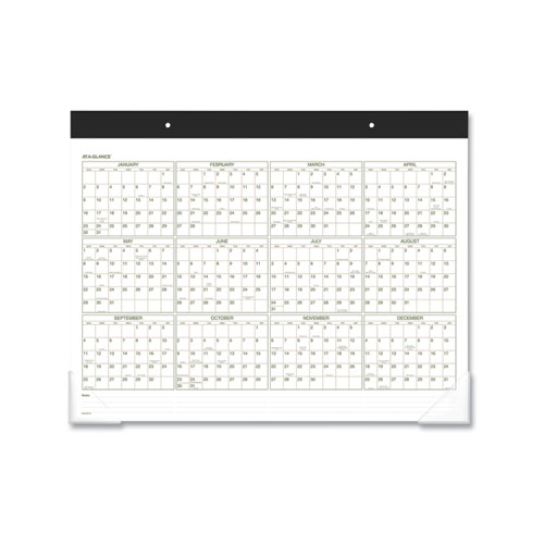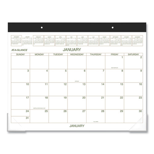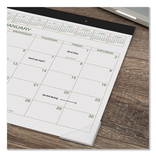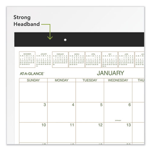 Desk pad covers a 12 month date range January December. High-quality paper features superior ink bleed resistance. One month per page format has unruled daily blocks for open scheduling and a full year of reference calendar blocks. Special features include a 2021 reference calendar and two clear corner protectors to make sure pages like flat. Calendar has a wide black headband and two holes for optional wall hanging. Pages measure 22″ x 17″.