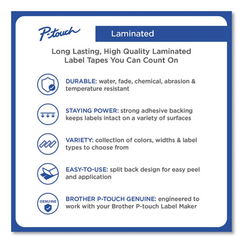 Brother label tape is compatible with P-Touch label printers and is perfect for labeling kitchen, shelving, and supply cabinets. The labels are easy to print and apply to a variety of surfaces. The split back of the P-Touch label tape can be removed with ease, which makes Brother TZe replacement label tape simple to peel and apply to tables and shelves made of steel, wood, plastic and more. This product is a Brother Genuine replacement product, which will help reduce the possibility of damage to the P-touch label maker. Using Brother Genuine supplies delivers quality results and protects your P-touch from damage.