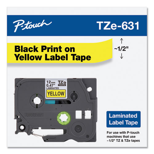 TZe Standard Adhesive Laminated Labeling Tape, 0.47" x 26.2 ft, Black on YellowTZe Standard Adhesive Laminated Labeling Tape, 0.47″ x 26.2 ft, Black on Yellow