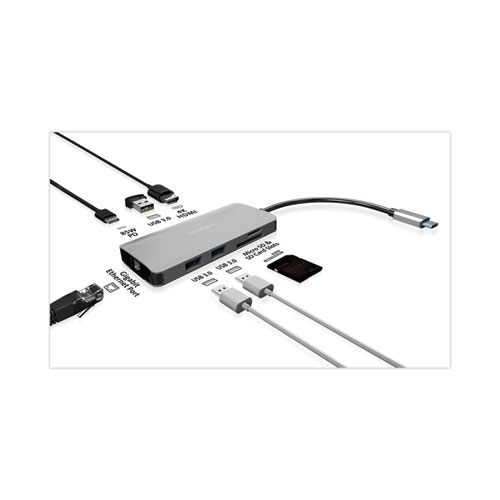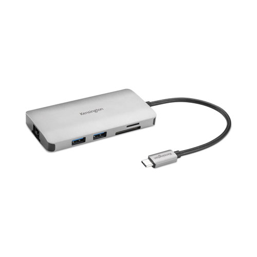 The UH1400P USB-C 8-in-1 Driverless Mobile Hub delivers the connectivity you need when on the go or at home. Universally compatible, this portable hub is an ideal plug-and-play solution for devices running Windows®, Mac®OS, Chrome™OS, iOS/iPad®OS or Android™; no need to download, install or update software. Ultra HD (Single 4K @ 60 Hz) extends visual productivity with high resolution, contrast and color depth. Supports up to 85 W power pass-through, so you can use your USB-C power supply to quickly and easily charge any USB-C enabled laptop (laptop must support Power Delivery). Optional Kensington 100 W Power Adapter (K33821) sold separately. 3 x USB-A 3.2 Gen1 ports (1 x supporting charging up to 5V/1.5A) and 1 x USB-C 3.2 Gen1 port. Compact design fits in your backpack or carrying case for easy portability, while a 9.8 cable allows the hub to be placed out of the way when connected. Built-in SD and Micro SD 3.0 UHS-I card readers make transferring photos fast, easy and convenient.