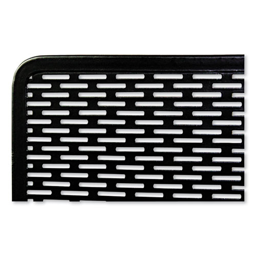 Strong, professional grade punched metal with decorative urban style slotted pattern. High quality satin finish complements any décor. Features protective feet to prevent wear and scratches on the desktop surface. Reinforced rounded edges provide durability and attractive detailing. Securely displays and organizes magazines, catalogs, files and literature on your desktop, keeping them within reach. The generous front panel provides four-sided base protection and structure to the contents so they won’t fall out.