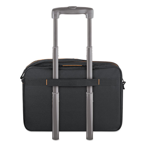 Multiple fully padded pockets protect various laptops from 13″ up to 17.3″. Internal iPad®/tablet pocket. Full length front zippered pocket. Front zip-down organizer section. File compartment. Padded carry handles. Removable/adjustable shoulder strap. Back strap slides over luggage handle.