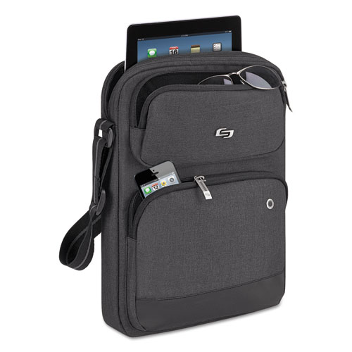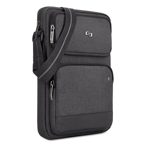 Fully padded 11″ tablet compartment. Scratch-resistant liner. Front zippered pocket. Front zip-down organizer section. Adjustable shoulder strap.