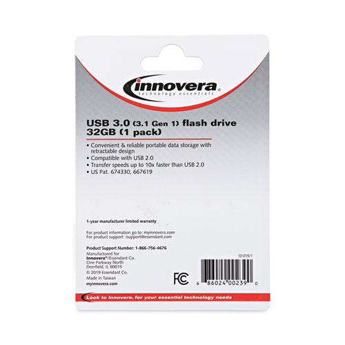 Innovera® USB 3.0 Flash Drive is an ultra-fast drive with a no-loss, retractable cap. USB flash drives are a convenient and secure way to move and store your digital files. Simple plug-and-play design. Great for sharing photos, presentations, files and documents. Great on-the-go flash drives that are perfect for packing in a laptop bag, briefcase, purse, or backpack for easy transfer of files from one computer to another. Compatible with all standard USB ports.