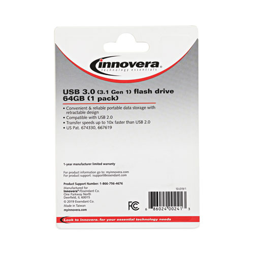 Innovera® USB 3.0 Flash Drive is an ultra-fast drive with a no-loss, retractable cap. USB flash drives are a convenient and secure way to move and store your digital files. Simple plug-and-play design. Great for sharing photos, presentations, files and documents. Great on-the-go flash drives that are perfect for packing in a laptop bag, briefcase, purse, or backpack for easy transfer of files from one computer to another. Compatible with all standard USB ports.