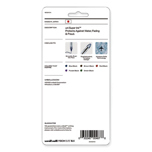 Product Details** Global Product Type Hybrid Pens Pen Style Stick Pen Tip Type Conical Pen Point Size Type Bold Color Family Multicolor Erasable Ink No Refillable No Pen Sub-Brand & Product Family VISION ELITE™ BLX Series Pen Type Hybrid Gel Pen Pen Point Size 0.8 mm Pen Ink Color(s) Assorted Pen Ink Color(s) Assortment Blue-Infused Black,Brown-Infused Black,Green-Infused Black,Purple-Infused Black,Red-Infused Black Pen Barrel Color(s) Assorted Pen Barrel Color(s) Assortment White/Blue/Clear,White/Brown/Clear,White/Green/Clear,White/Purple/Clear,White/Red/Clear Pen Cap Color(s) Assorted Pen Cap Color(s) Assortment White/Blue,White/Brown,White/Green,White/Purple,White/Red Airplane-Safe Ink No Special Ink Properties uni Super Ink™ Pen Grip Type Smooth Visible Ink Supply Yes Pocket Clip Indicator Yes Product Biodegradability Indicator N Product Biodegradability in Days 0 Product Compostability Indicator N Pre-Consumer Recycled Content Percent 0% Post-Consumer Recycled Content Percent 0% Total Recycled Content Percent 0% Country Of Origin JP Carton Weight 12 lbs. Carton Pack Quantity 48 ST Pack Quantity 5 EA UPC 030246004678 UNSPSC 44121701 Shipping Weight & Item Dimensions Weight 0.25 lbs. Length 7.63 in Height 0.65 in Width 3.75 in