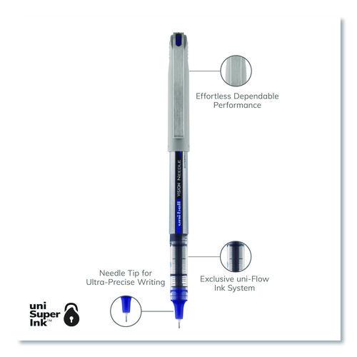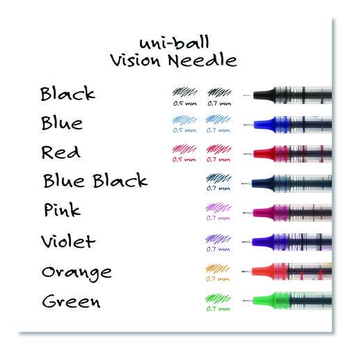 Stock your office, home or classroom with Vision Needle Stick Rollerball Pens from uni-ball featuring a strong, long lasting 0.7 mm fine point. These needle point pens are designed with a bend resistant tip for better accuracy. Even-flowing, pigment-based roller ink delivers a smooth writing experience for reliably smooth, vivid lines and a rich color for improved clarity and readability. Use these fine point rollerball pens to create perfect letters, numbers and graphics. Innovative uni Super Ink technology effectively entraps the liquid ink into the paper, producing fraud, fade and water-resistant documents that resist check washing or bleaching. The 0.7mm fine needle point allows you to create ultra-precise, straight edge lines with ease. The exclusive Uni-Flow Ink System ensures a consistent, delightfully fluid writing experience, and a translucent window ensures that you don’t run out of ink unexpectedly. Enjoy beautiful clean lines and give all of your ideas a burst of brilliant color with this classic style fine point rollerball pen.