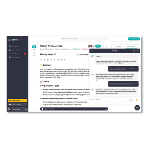 The perfect audio recorder for easily capturing voice recordings including notes, interviews, and small meeting settings. Thanks to its excellent sound quality, long-lasting battery and large extendable memory, it is the ideal alternative to recording with your smartphone. Combined with Sembly’s AI Speech-to-Text Cloud Software, you can even turn your recordings into text quickly and accurately. Simply upload your files to Sembly when you are back at your computer and let it automatically convert your recordings to text for you.