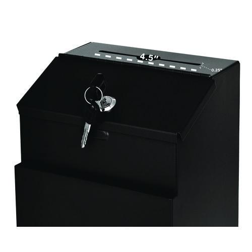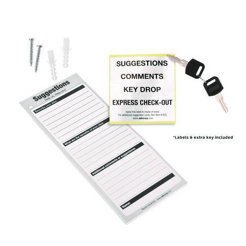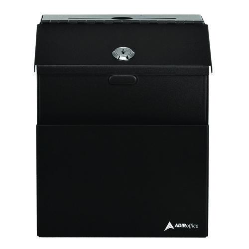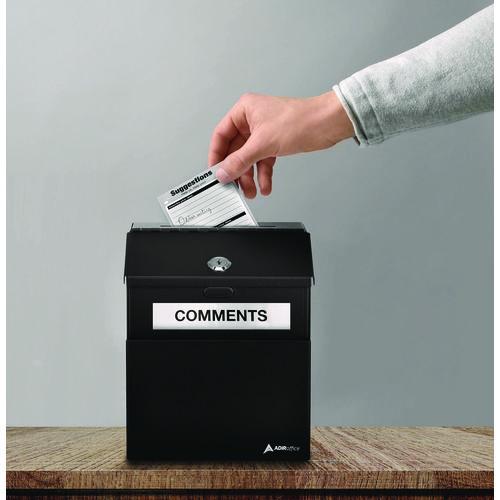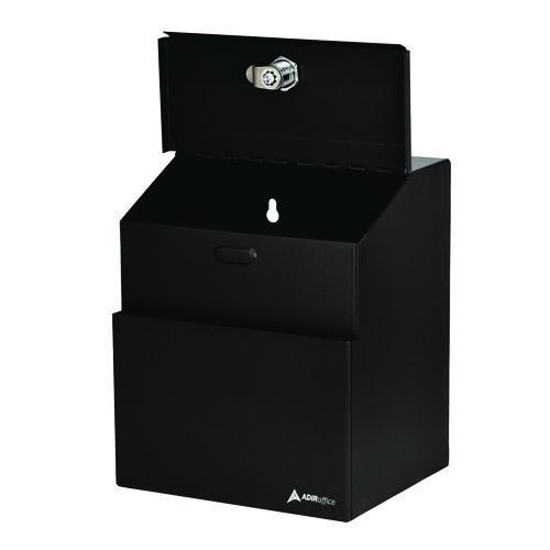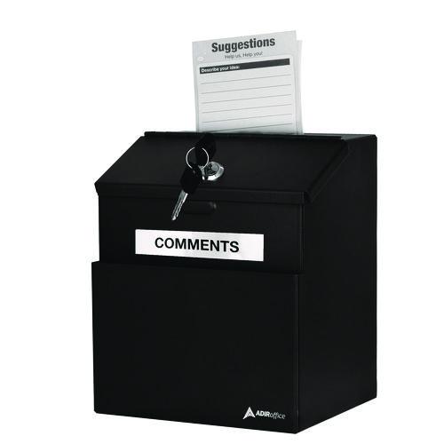Encourage valuable customer and employee feedback with AdirOffice Steel Suggestion Box. Made using durable, steel construction with a powder-coated, scratch-resistant finish, this box will last you well into the future. It can be easily mounted on the wall with included hardware or simply set down on a table, desk or another flat surface. Place it in any company to get suggestions and/or comments from your employees or customers. Knowing that their comments will be kept confidential and that they can remain anonymous allows people to voice their greatest concerns and to succeed in business, communication is key. With a secure lock to keep everything safe inside, this box also provides the perfect solution for dropping off keys and payments after hours. Two keys are included with this purchase for quick and easy access inside. The deposit slot is 4.75″ length x 0.13″ width, making it ideal for dropping off payments, interoffice mail or suggestion cards. Additionally, the opening in the middle is large enough to drop off keys. A front pocket is ideal for holding pens, suggestion cards and small envelopes, allowing for writing suggestions and comments right on the spot. Stick-on labels that dedicate the box for suggestions, comments or for dropping off keys, as well as 25 suggestion cards are also included with this purchase.