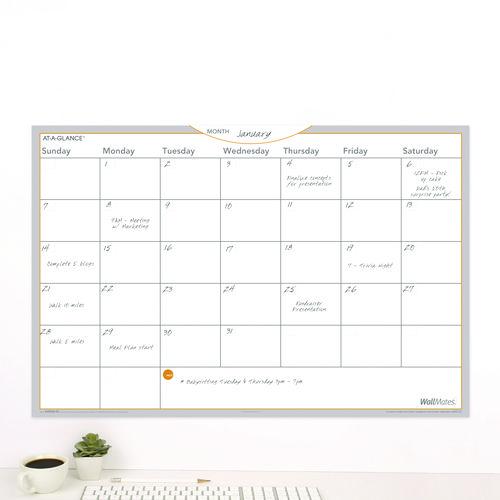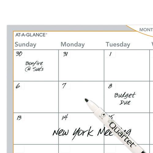 Product Details** Global Product Type Wall Calendars Dated No Academic Year No Calendar Format Monthly Color Family White Refillable No Calendar Spread Format One Month per Page Julian Dates No Size (Bound-Side First) 36 x 24 Sheet Color(s) White/Gray/Orange Hanger Style Repositionable Self-Adhesive Strip Reversible No Seasonal Availability No Product Biodegradability Indicator N Product Biodegradability in Days 0 Product Compostability Indicator N Package Includes (1) Dry Erase Marker,(1) Three-Year Reference Calendar Strip Pre-Consumer Recycled Content Percent 0% Post-Consumer Recycled Content Percent 0% Total Recycled Content Percent 0% Footnote 1 Block Size: 4.81 x 3.31 Special Features Monthly Planning Surface-Undated monthly blocks and HOT Spot reminder-notes area with three-year reference calendar. Country Of Origin US Carton Weight 4 lbs. Carton Pack Quantity 6 EA Pack Quantity 0 UPC 038576098985 UNSPSC 44112002 Shipping Weight & Item Dimensions Weight 0.583 lbs. Length 0.75 in Height 24.25 in Width 36.25 in