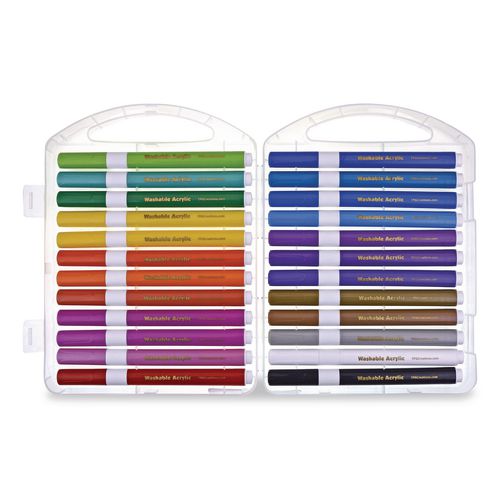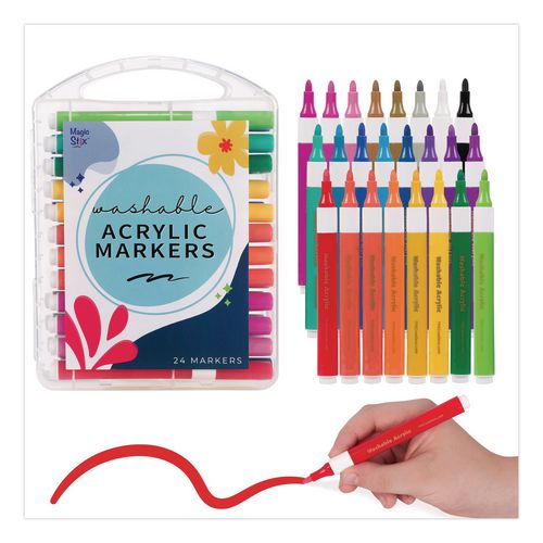 Product Details** Global Product Type Art Markers Marker Ink Type Washable Marker Grade School Grade Marker Tip Type Bullet Color Family Multicolor Marker Tip Size (text) Fine Marker Tip Size (numeric) 2 mm Marker Color(s) Assorted Marker Color Assortment Black,Blood Orange,Brown,Cucumber,Grass Green,Gray,Hot Pink,Indigo,Magenta,Navy Blue,Ocean Blue,Orange,Pink,Purple,Red,Royal Blue,Sky Blue,Soil,Sunshine,Tangerine,Teal,Violet,White,Yellow Age Recommendation Ages 5 and Up Marker Series Magic Stix Product Biodegradability Indicator N Product Biodegradability in Days 0 Product Compostability Indicator N Pre-Consumer Recycled Content Percent 0% Post-Consumer Recycled Content Percent 0% Total Recycled Content Percent 0% Country Of Origin CN Carton Weight 17 lbs. Carton Pack Quantity 24 PK Pack Quantity 24 EA UPC 634901004982 UNSPSC 60121503 Shipping Weight & Item Dimensions Weight 0.7 lbs. Length 4.25 in Height 8 in Width 6 in