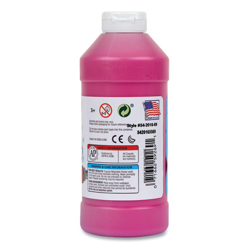Product Details** Global Product Type Art Paints & Primers Paint Sub-Category Poster Tempera Intended Application Environment Interior Finish/Sheen Matte Color Family Purple Number of Colors 1 Recommended Level of Ventilation None Color(s) Magenta Volume Capacity 16 oz Packaging Type Bottle Binder/Vehicle Ingredient(s) Water-Soluble Adhesive Diluent/Solvent Ingredient(s) Water Application Method Brush,Sponge Washable/Removable Yes Product Biodegradability in Days 0 Compliance Standards ACMI AP Non-Toxic Certified,Conforms to ASTM D 4236 Pre-Consumer Recycled Content Percent 0% Post-Consumer Recycled Content Percent 0% Total Recycled Content Percent 0% Country Of Origin US Carton Weight 16 lbs. Carton Pack Quantity 12 EA Pack Quantity 0 UPC 071662592691 UNSPSC 60121210 Shipping Weight & Item Dimensions Weight 1.3 lbs. Length 6.75 in Height 2.75 in Width 2.7 in