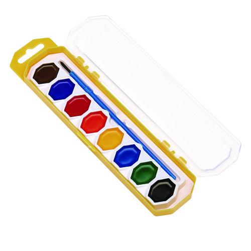 Product Details** Global Product Type Art Paints & Primers Paint Sub-Category Watercolor Intended Application Environment Interior Finish/Sheen Matte Color Family Multicolor Number of Colors 8 Recommended Level of Ventilation None Color(s) Assorted Color Assortment Black,Blue,Brown,Green,Orange,Purple,Red,Yellow Packaging Type Palette Tray Binder/Vehicle Ingredient(s) Natural Gum Arabic Diluent/Solvent Ingredient(s) Water Application Method Brush,Sponge Washable/Removable Yes Age Recommendation Ages 3 and Up Product Biodegradability Indicator N Product Biodegradability in Days 0 Product Compostability Indicator N Package Includes (1) Artist-Quality Paintbrush Pre-Consumer Recycled Content Percent 0% Post-Consumer Recycled Content Percent 0% Total Recycled Content Percent 0% Country Of Origin CN Carton Weight 12 lbs. Carton Pack Quantity 72 ST Pack Quantity 1 ST UPC 884920106512 UNSPSC 60121221 Shipping Weight & Item Dimensions Weight 0.16 lbs. Length 8.78 in Height 2.18 in Width 0.75 in