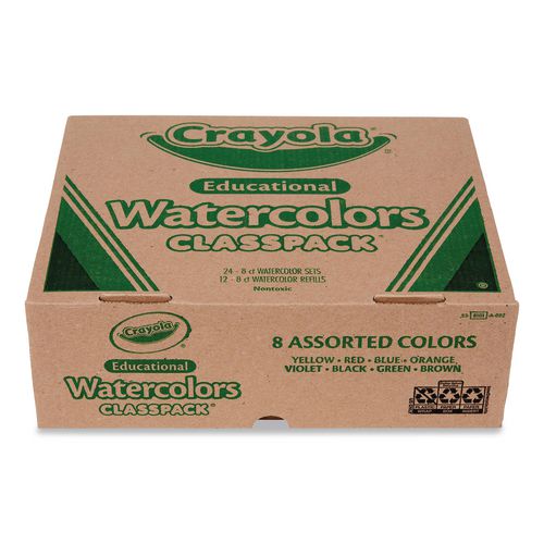 Product Details** Global Product Type Art Paints & Primers Paint Sub-Category Watercolor Intended Application Environment Interior Finish/Sheen Matte Color Family Multicolor Number of Colors 8 Recommended Level of Ventilation None Color(s) Assorted Color Assortment Black,Blue,Brown,Green,Orange,Purple,Red,Yellow Packaging Type Palette Tray Binder/Vehicle Ingredient(s) Water-Soluble Adhesive Diluent/Solvent Ingredient(s) Water Application Method Brush,Sponge Washable/Removable Yes Product Biodegradability Indicator N Product Biodegradability in Days 0 Product Compostability Indicator N Package Includes (24) Sets, Each Set: (1) Premium Eight-Color Oval Pan Set, (1) Paintbrush, (1) Hinged Hardcase,(12) Premium Eight-Color Oval-Pan Open-Palette Refill Strips Compliance Standards ACMI AP Non-Toxic Certified Pre-Consumer Recycled Content Percent 0% Post-Consumer Recycled Content Percent 0% Total Recycled Content Percent 0% Special Features Eight Colors Country Of Origin US Carton Weight 6 lbs. Carton Pack Quantity 1 ST Pack Quantity 36 EA UPC 071662381011 UNSPSC 60121221 Shipping Weight & Item Dimensions Weight 5.95 lbs. Length 10.38 in Height 4.5 in Width 13.13 in