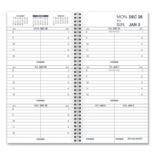 This weekly Appointment Book Planner refill will help you plan out each week in detail. It allows for easy event planning 12 months from January to December. High-quality paper features superior ink bleed resistance One week per two-page spread with hourly appointments from 8AM to 5PM Monday to Friday for comprehensive scheduling. Saturday and Sunday are split on the right hand page and are untimed for leisurely planning. Past, current and future month reference on each two-page spread for long term planning Wirebound refill pages stay secure in your Appointment Book Planner. 3.25″ x 6.25″ page size. Refill only. Compatible with AT-A-GLANCE Refillable Weekly Appointment Book Planner (sold separately).