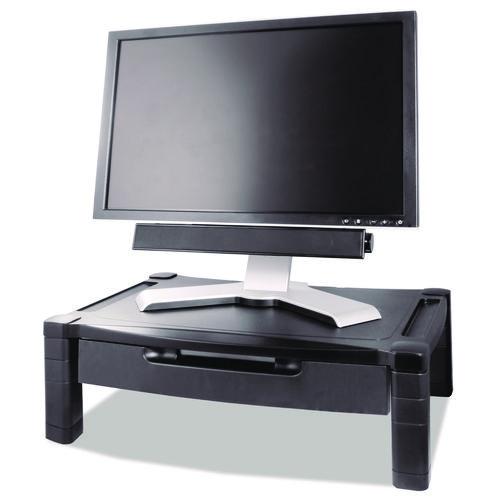 Product Details** Global Product Type Desktop Monitor Stands OEM/Compatible Compatible Workstation Type Mobile Workstation,Traditional Desk/Table Color Family Black Number of Shelves 1 Number of Drawers 1 Width (Max) 20″ Depth (Max) 13.25″ Height (Min) 3″ Height (Max) 6.5″ Weight Capacity 50 lb Color(s) Black Material(s) Plastic Product Biodegradability in Days 0 Pre-Consumer Recycled Content Percent 0% Post-Consumer Recycled Content Percent 30% Total Recycled Content Percent 30% Special Features With Supplies Drawer Country Of Origin TW Carton Weight 32 lbs. Carton Pack Quantity 6 EA Pack Quantity 0 UPC 750333635201 UNSPSC 43212002 Shipping Weight & Item Dimensions Weight 5 lbs. Length 22 in Height 3 in Width 14.5 in Warranty Manufacturer’s limited one-year warranty.