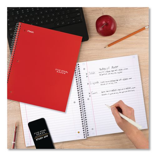 Product Details** Global Product Type General Purpose Notebooks Pocket Sized No Book-Binding Type Spiral Coil Color Family Multicolor Number of Subjects/Sections 3 Sheet Size (Bound-Side First) 10.5 x 8.63 Sheet Rule/Format Type Wide/Legal Rule Book-Binding Details Spiral Lock® Book-Binding Edge Side Cover Color Assorted Cover Color Assortment Black,Fire Red,Tidewater Blue Book-Spine Length 10.5″ Book Width 9.5″ Front-Cover Material Plastic Back-Cover Material Coated Paperboard Number of Section Dividers 2 Sheets per Book/Journal 150 Sheet Color White Sheet Ruling Size 11/32″ Note-Rule Lines per Sheet 25 Sheet-Ruling Color Blue Hole-Punch Details Side: 3-Hole Sheet Perforation Details Neat Sheet® Sheet Basis Weight (lb) 15 lb Bond Number of Pockets 4 Pocket Details (2) Double-Sided Reinforced Pocket Pages Dated No Product Biodegradability Indicator N Product Biodegradability in Days 0 Product Compostability Indicator N Pre-Consumer Recycled Content Percent 0% Post-Consumer Recycled Content Percent 0% Total Recycled Content Percent 0% Disclaimer Statement Guarantee is valid for one year from purchase or delivery date, whichever is longer. Does not cover misuse. Go to Five Star® website for details. Country Of Origin US Carton Weight 9 lbs. Carton Pack Quantity 2 PK Pack Quantity 3 EA UPC 038576827516 UNSPSC 14111514 Shipping Weight & Item Dimensions Weight 4.3 lbs. Length 1 in Height 10.5 in Width 9.5 in