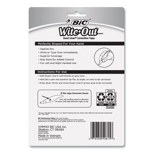 Make fast, easy, and precise corrections with BIC Wite-Out Brand Exact Liner Correction Tape. Tear-resistant film-based tape comes in a dispenser with a natural shape that fits your hand and a grip zone for comfort and control. The tear-resistant film-based tape requires no dry time and won’t bleed or drip, so you can instantly write or type your corrections over it. For convenience, BIC Wite-Out Brand Exact Liner Correction Tape is suitable for left- or right-handed use and has a colorful, translucent body so you can see exactly how much tape remains. A self-winding wheel lets you easily rewind the tape should it become loose.