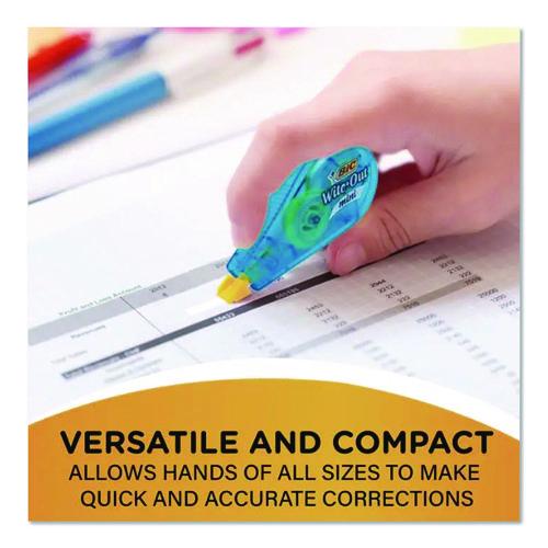 Fix mistakes fast with BIC Wite-Out Brand Mini Correction Tape! Suitable for lefties and righties, these brightly-colored correction tape dispensers are compact enough to fit in any bag. The correction tape goes on dry, allowing you to make instant corrections with no mess and no waiting time, while the convenient size allows hands of all sizes to make quick and accurate corrections.