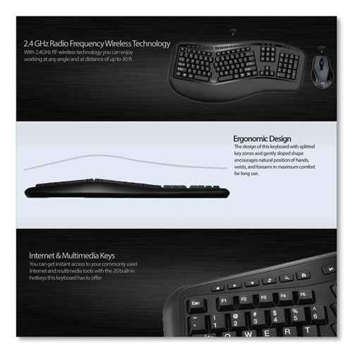 The Adesso Wireless Ergonomic Keyboard and Mouse offers users two advanced input devices with ergonomic design, multifunctional features and a wireless range of up to 30 feet. The design of this keyboard with split key zones and gently sloped shape encourages natural position of hands, wrists, and forearm in maximum comfort for long use. The included wireless laser optical mouse not only provides a comfortable ergonomic design but also includes a DPI switch for changing resolution from 800 DPI to 1200 DPI and 1600 DPI for better navigation on larger screen styles. Also includes browser forward and back browser buttons for improved navigation. Quiet membrane key switches provide a better tactile response and a quieter typing experience lasting up to five million key strokes.