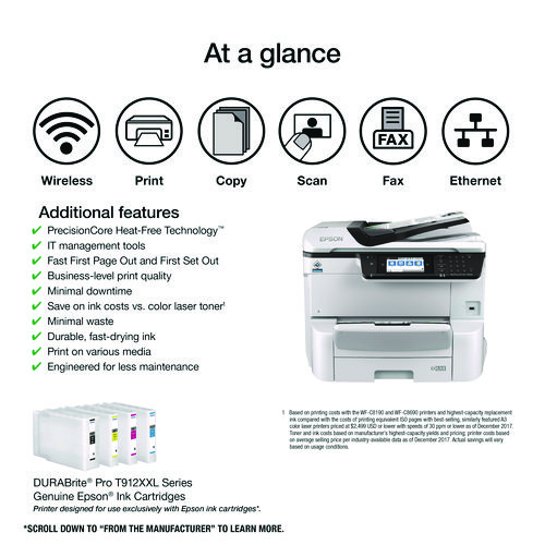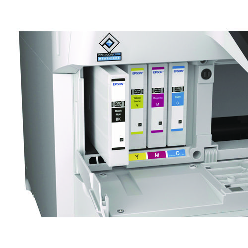Powered by PrecisionCore Heat-Free® technology, the WorkForce® Pro WF-C8690 has the lowest power consumption in its class. Plus, it features auto duplexing for greater productivity. A true workhorse, the WF-C8690 offers print speeds of 24 ISO ppm (black/color), a fast first page out, and fast scan speeds. With a paper capacity up to 1,835 sheets, you’ll replace paper less often. Ideal for busy workgroups, the printer also includes PCL and Adobe® PostScript® 3™ support, plus compatibility with ISV and third-party software solutions.