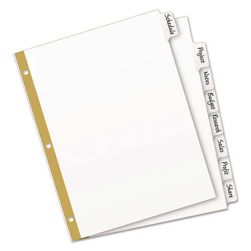 Product Details** Global Product Type Customizable Index Dividers Index Divider Style Customizable Tab Orientation Side Tab Tab Style 8-Tab Color Family White Punched/Unpunched 3-Hole Punched Index Divider Size 11 x 8.5 For Use With Ring Binders Index Divider Material(s) Paper Index Divider Color(s) White Tab Material(s) Laminated Paper Tab Color(s) White Binding Edge Feature(s) Single-Sided Gold Plastic Edge Reinforcing Index Divider Form Quantity 1 Set Product Biodegradability in Days 0 Pre-Consumer Recycled Content Percent 0% Post-Consumer Recycled Content Percent 0% Total Recycled Content Percent 0% Country Of Origin MX Carton Weight 8 lbs. Carton Pack Quantity 48 ST Pack Quantity 8 EA UPC 072782230784 UNSPSC 44122008 Shipping Weight & Item Dimensions Weight 0.157 lbs. Length 11 in Height 0.1 in Width 9.1 in