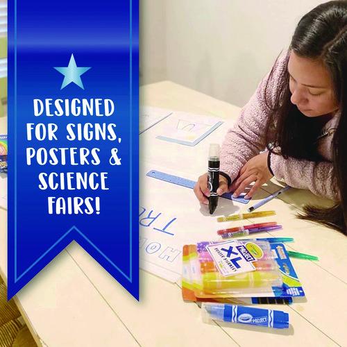 Make your assignments shine with the Crayola Project™ line. Though designed for posters, signs and science fair materials, these supersized markers are ideal for a wide variety of arts and crafts projects. No matter where you wish to aim your creativity, XL Poster Markers’ full coverage design can help you hit your target. Their unique, thin and thick chisel tips are 50% wider than common marker nibs but taper to a fine, sharp point, allowing you to create super thick lines or very thin ones, depending on what you need to do at the time. School projects, presentations, posters, signs, decorations and more can more vividly stand out with crisp, neat lines when you choose Crayola® XL Poster Markers. Safe and washable, low-odor, non-toxic ink—ideal for children and adults, alike.