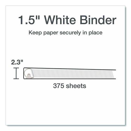Product Details** Global Product Type Ring Binders Binder Style View Number of Rings 3 Binder Size Capacity 1.5″ Ring Style Slant D-Ring Color Family White Binder Sheet Size 11 x 8.5 Binder Type Ring Binder Sheet Capacity 375 Binder Color(s) White Ring Mounting Back Cover Material(s) Polyolefin Binder Pocket Description (1) Front Cover Pocket,(1) Back Cover Pocket Insert Description Front,Spine,Back Front Cover Insert Size 8.5 x 11 Spine Insert Size 1.6 x 11.5 Back Cover Insert Size 8.5 x 11 Product Biodegradability Indicator N Product Biodegradability in Days 0 Product Compostability Indicator N Green Information Paper contains 10% post-consumer recycled content, 10% total recycled content. Special Features Non-Stick Cover Country Of Origin MX Carton Weight 12 lbs. Carton Pack Quantity 12 EA Pack Quantity 0 UPC 083086263101 UNSPSC 44122003 Shipping Weight & Item Dimensions Weight 1.1 lbs. Length 11.6 in Height 2.2 in Width 11 in