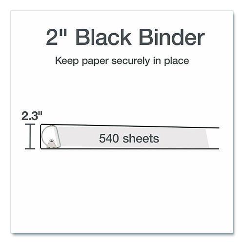 Product Details** Global Product Type Ring Binders Binder Style View Number of Rings 3 Binder Size Capacity 2″ Ring Style Slant D-Ring Color Family Black Binder Sheet Size 11 x 8.5 Binder Type Ring Binder Sheet Capacity 540 Binder Color(s) Black Ring Mounting Back Cover Material(s) Polyolefin Binder Pocket Description (1) Front Cover Pocket,(1) Back Cover Pocket Insert Description Front,Spine,Back Front Cover Insert Size 8.5 x 11 Spine Insert Size 2.5 x 11.5 Back Cover Insert Size 8.5 x 11 Product Biodegradability Indicator N Product Biodegradability in Days 0 Product Compostability Indicator N Pre-Consumer Recycled Content Percent 0% Post-Consumer Recycled Content Percent 10% Total Recycled Content Percent 10% Country Of Origin MX Carton Weight 22 lbs. Carton Pack Quantity 12 EA Pack Quantity 0 UPC 083086263217 UNSPSC 44122003 Shipping Weight & Item Dimensions Weight 1.353 lbs. Length 11.7 in Height 3 in Width 11.3 in