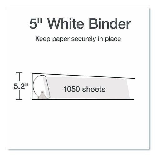 Product Details** Global Product Type Ring Binders Binder Style View Number of Rings 3 Binder Size Capacity 5″ Ring Style Slant D-Ring Color Family White Binder Sheet Size 11 x 8.5 Binder Type Ring Binder Sheet Capacity 1,100 Binder Color(s) White Ring Mounting Back Cover Material(s) Polyolefin Binder Pocket Description (1) Front Cover Pocket,(1) Back Cover Pocket Insert Description Front,Spine,Back Front Cover Insert Size 8.5 x 11 Spine Insert Size 4.38 x 11.5 Back Cover Insert Size 8.5 x 11 Product Biodegradability Indicator N Product Biodegradability in Days 0 Product Compostability Indicator N Green Information Paper contains 10% post-consumer recycled content, 10% total recycled content. Special Features Non-Stick Cover—Hole in spine for easy shelf removal. Country Of Origin MX Carton Weight 5 lbs. Carton Pack Quantity 2 EA Pack Quantity 0 UPC 083086263507 UNSPSC 44122003 Shipping Weight & Item Dimensions Weight 2.217 lbs. Length 12.6 in Height 5 in Width 11.6 in