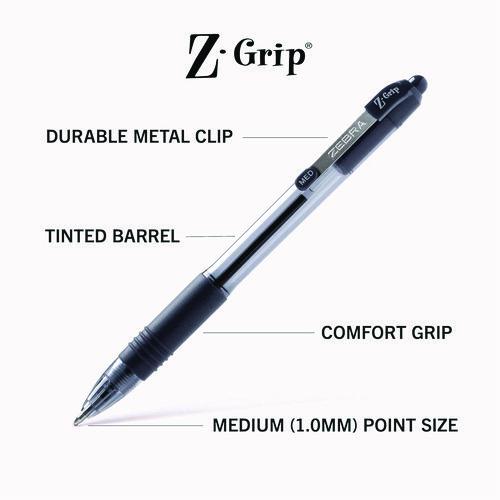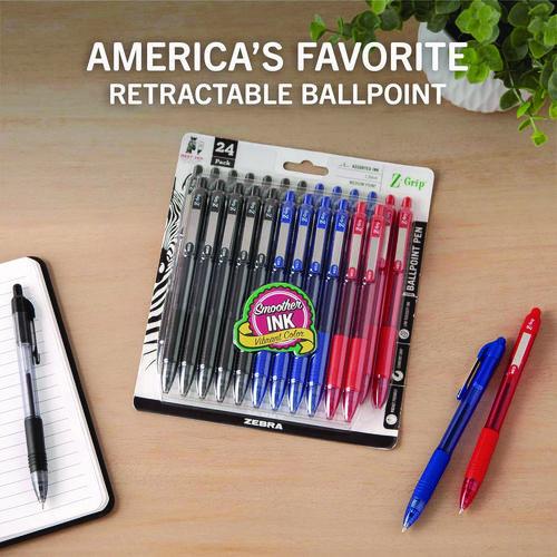 Product Details** Global Product Type Ballpoint Pens Pen Style Retractable Pen Tip Type Conical Pen Point Size Type Medium Color Family Multicolor Erasable Ink No Refillable No Pen Sub-Brand & Product Family Z-Grip® Pen Type Ballpoint Pen Pen Point Size 1 mm Pen Ink Color(s) Assorted Pen Ink Color(s) Assortment (12) Black,(8) Blue,(4) Red Pen Barrel Color(s) Assorted Pen Barrel Color(s) Assortment (12) Clear/Black,(8) Translucent Blue/Blue,(4) Translucent Red/Red Airplane-Safe Ink Yes Low-Viscosity Ink No Pen Grip Type Soft Rubber Visible Ink Supply Yes Pocket Clip Indicator Yes Product Biodegradability in Days 0 Pre-Consumer Recycled Content Percent 0% Post-Consumer Recycled Content Percent 0% Total Recycled Content Percent 0% Country Of Origin CN Carton Weight 29 lbs. Carton Pack Quantity 48 PK Pack Quantity 24 EA UPC 045888122246 UNSPSC 44121704 Shipping Weight & Item Dimensions Weight 0.594 lbs. Length 8.918 in Height 1.044 in Width 8.892 in